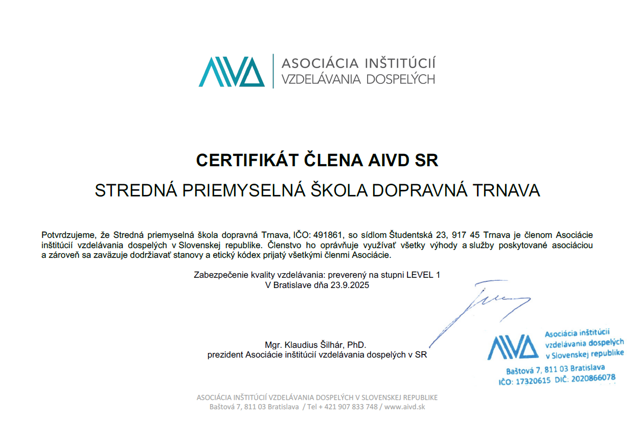 SPŠ dopravná Trnava - certifikovaná vzdelávacia inštitúcia